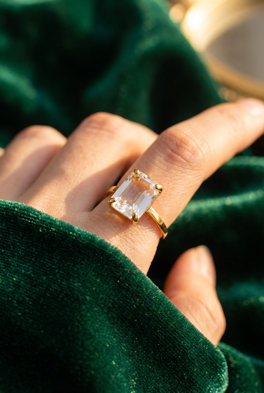 Ring in 925 Sterling Silver gold-plated with a transparent crystal stone box to finish. Simple, minimalist, and adds color to our day!