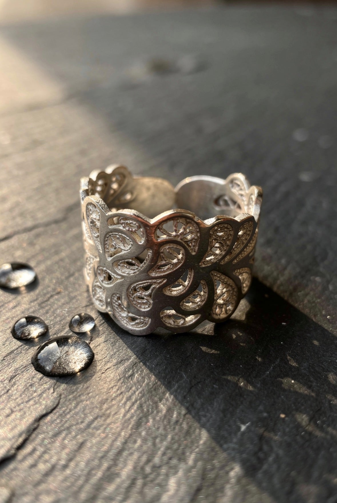 Ring in 925 Sterling Silver with delicate filigree work, inspired by Portuguese artisanal tradition. The lace-like design creates an elegant play of light and shadow, highlighting its lightness and sophistication. It combines femininity, elegance, and timelessness, making it perfect for both special occasions and elevating an everyday look.