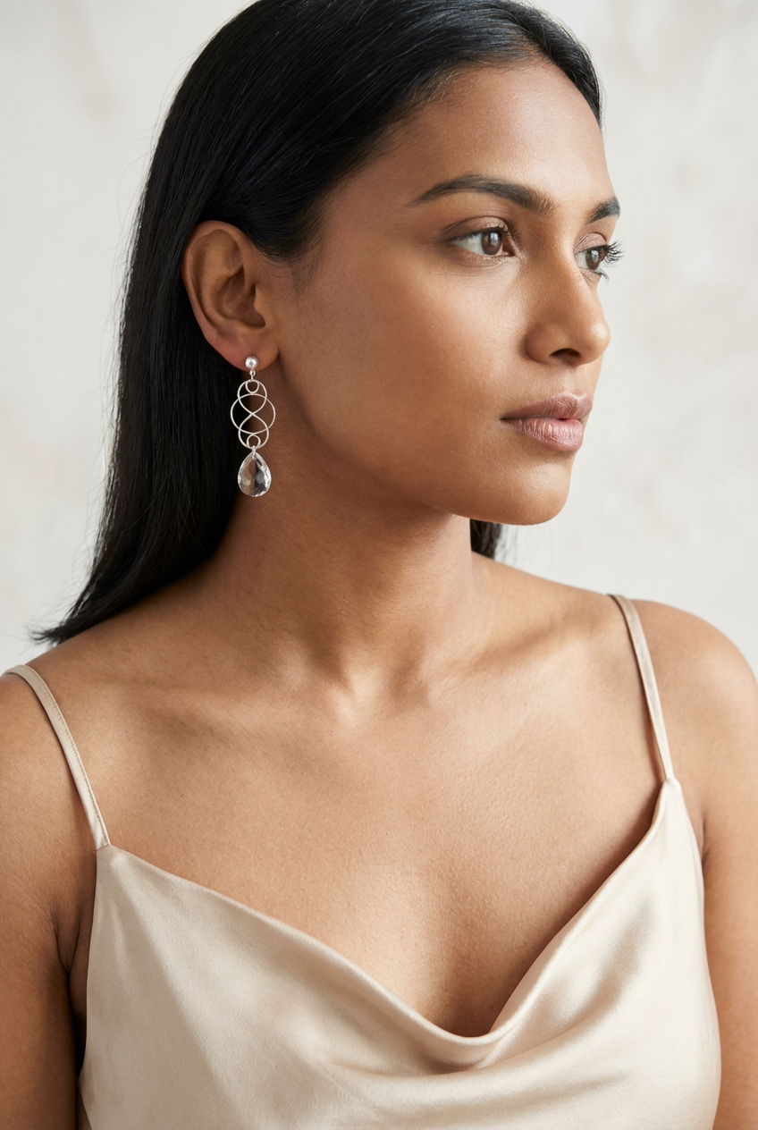 Earrings in 925 Sterling Silver with an infinity effect in a circle, accompanied by a transparent natural stone.