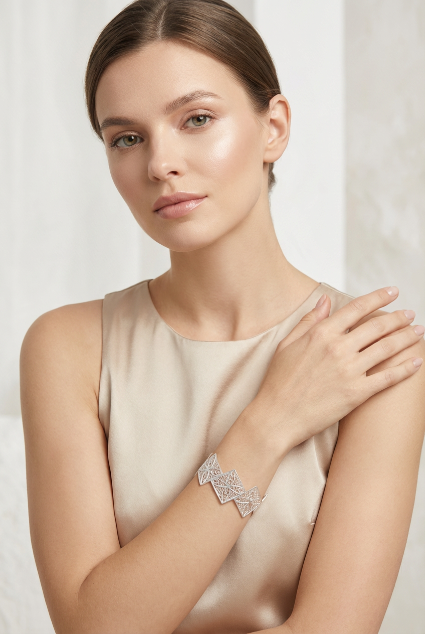 This 925 Sterling Silver bracelet is a true work of art, combining the delicacy of Portuguese filigree with a striking geometric design. Each link, handcrafted, reflects the sophistication of traditional goldsmithing, creating a unique piece that conveys timeless elegance.