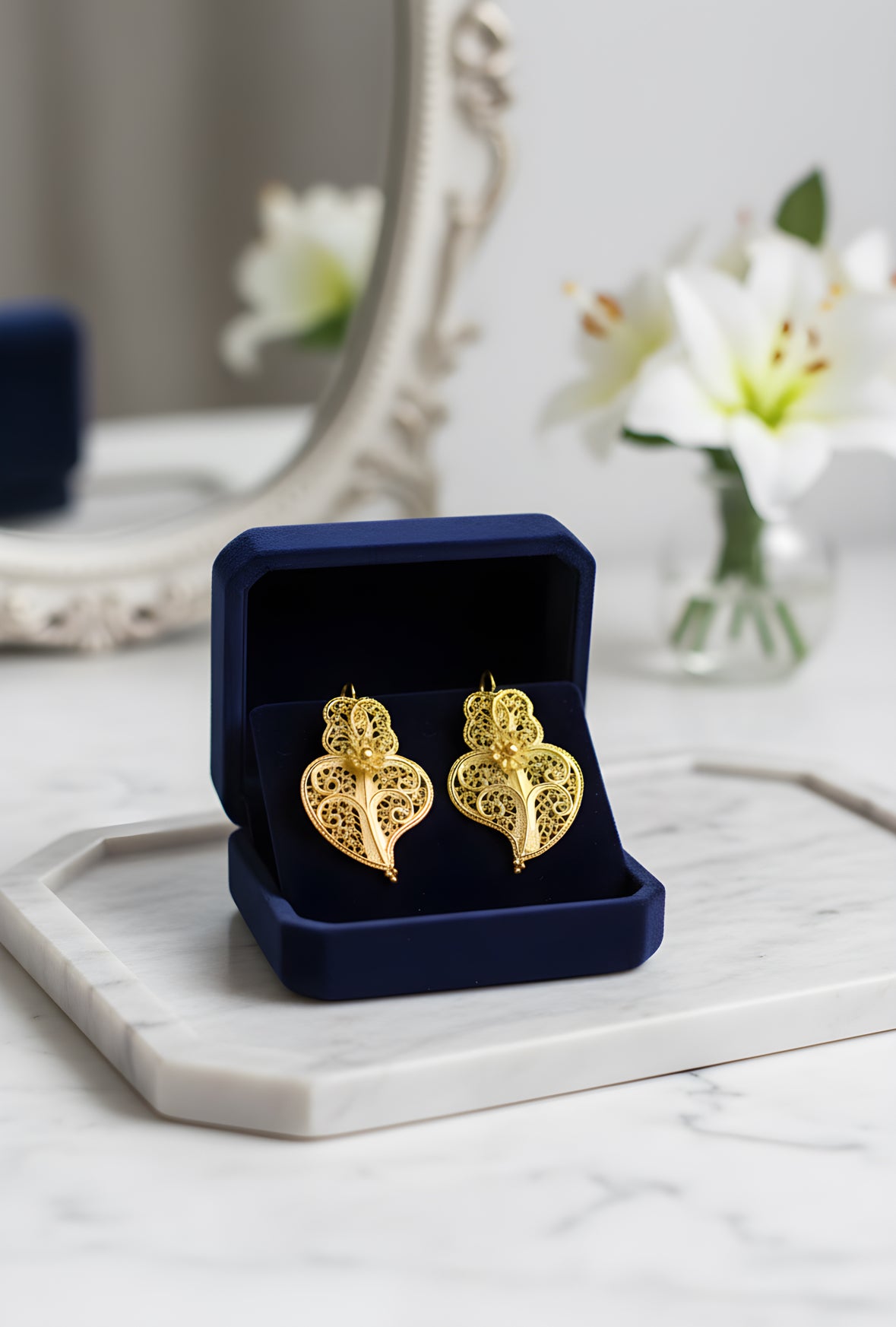Brincos Coração de Viana em Prata de Lei 925 - O "Coração de Viana" foi criado inicialmente no final do século XVIII por ordem da Rainha D. Maria I, como uma homenagem ao Sagrado Coração de Jesus após o nascimento do seu filho. A peça era, inicialmente, um símbolo religioso, com as "chamas" do topo a simbolizar o fogo da devoção religiosa.