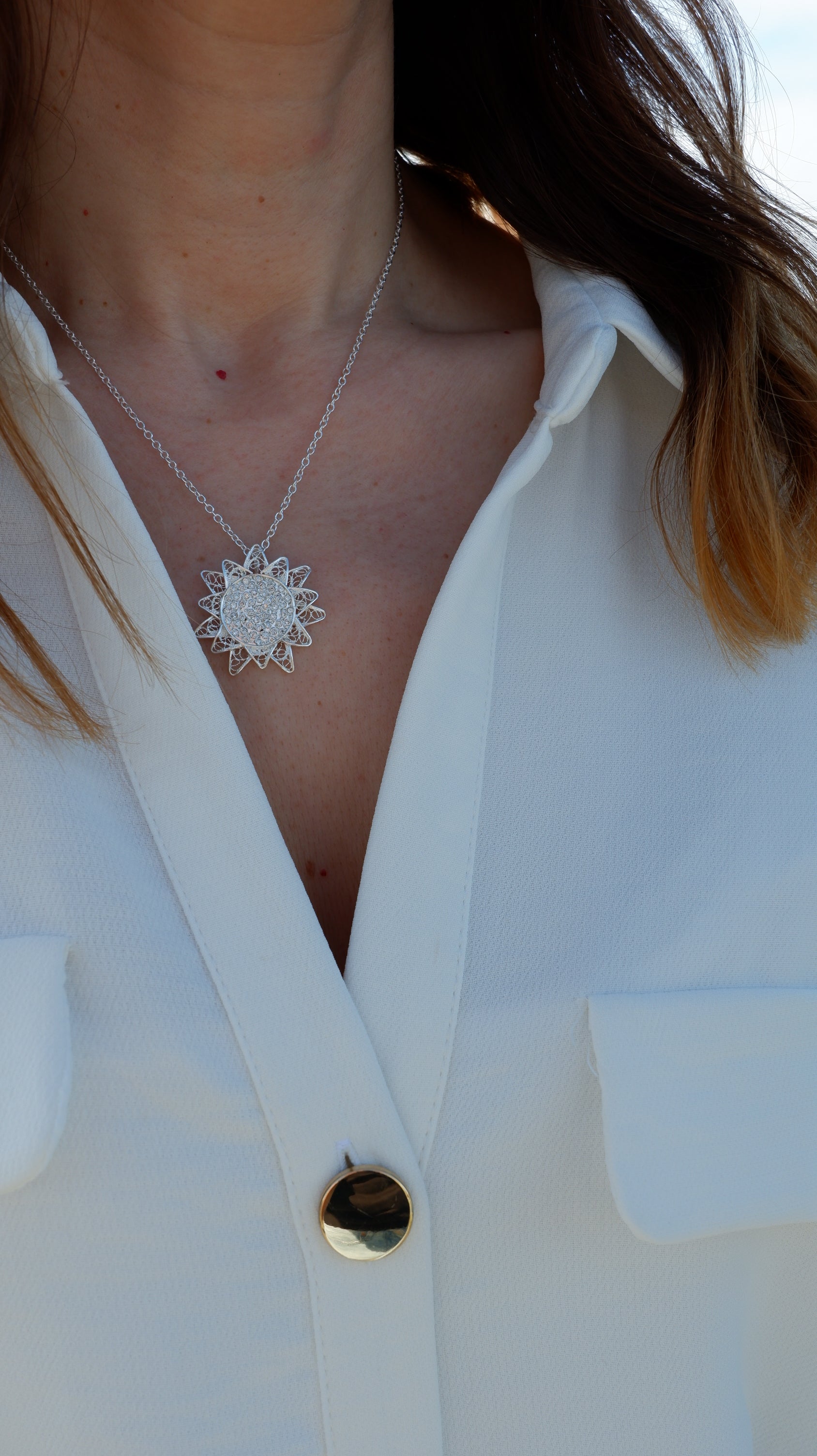 Colar em Prata de Lei 925 trabalhado à mão em filigrana e com alta cravação de zircónias. O seu design Girassol é mandatório para as/os amantes desta flor que simboliza a longevidade.