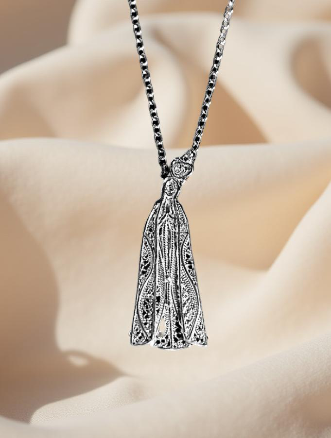 Colar em Prata de Lei 925 com a ilustração de Nossa Senhora de Fátima - representa a esperança, a fé, a conversão e a paz, através de uma invocação mariana ligada às aparições que ocorreram em Fátima, Portugal, em 1917.