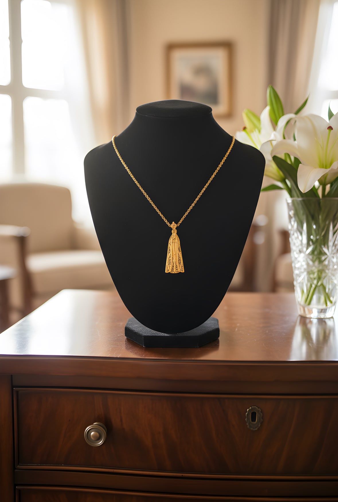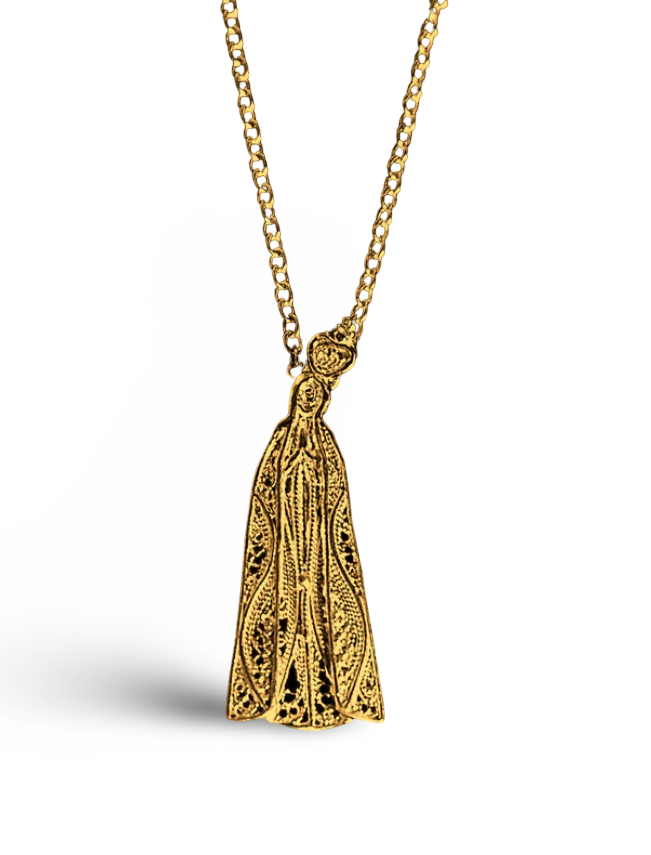 Colar em Prata de Lei 925 com a ilustração de Nossa Senhora de Fátima - representa a esperança, a fé, a conversão e a paz, através de uma invocação mariana ligada às aparições que ocorreram em Fátima, Portugal, em 1917.