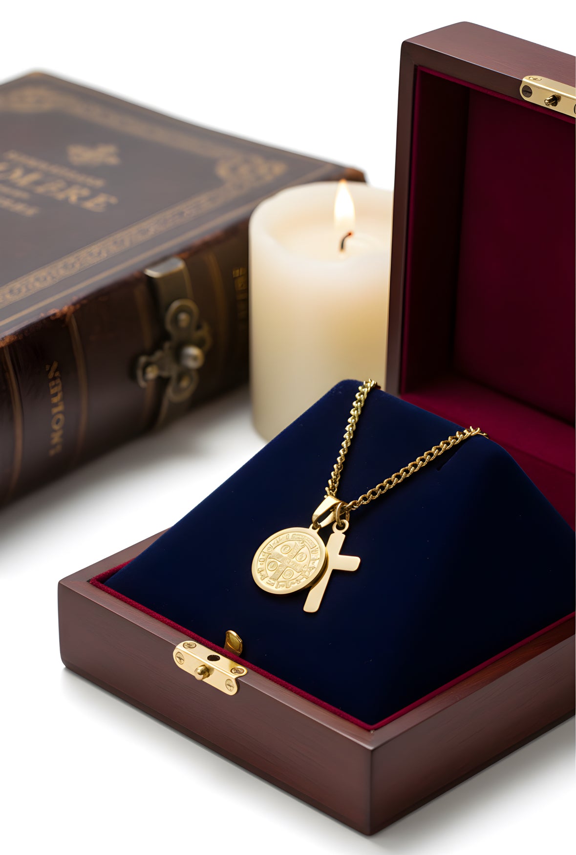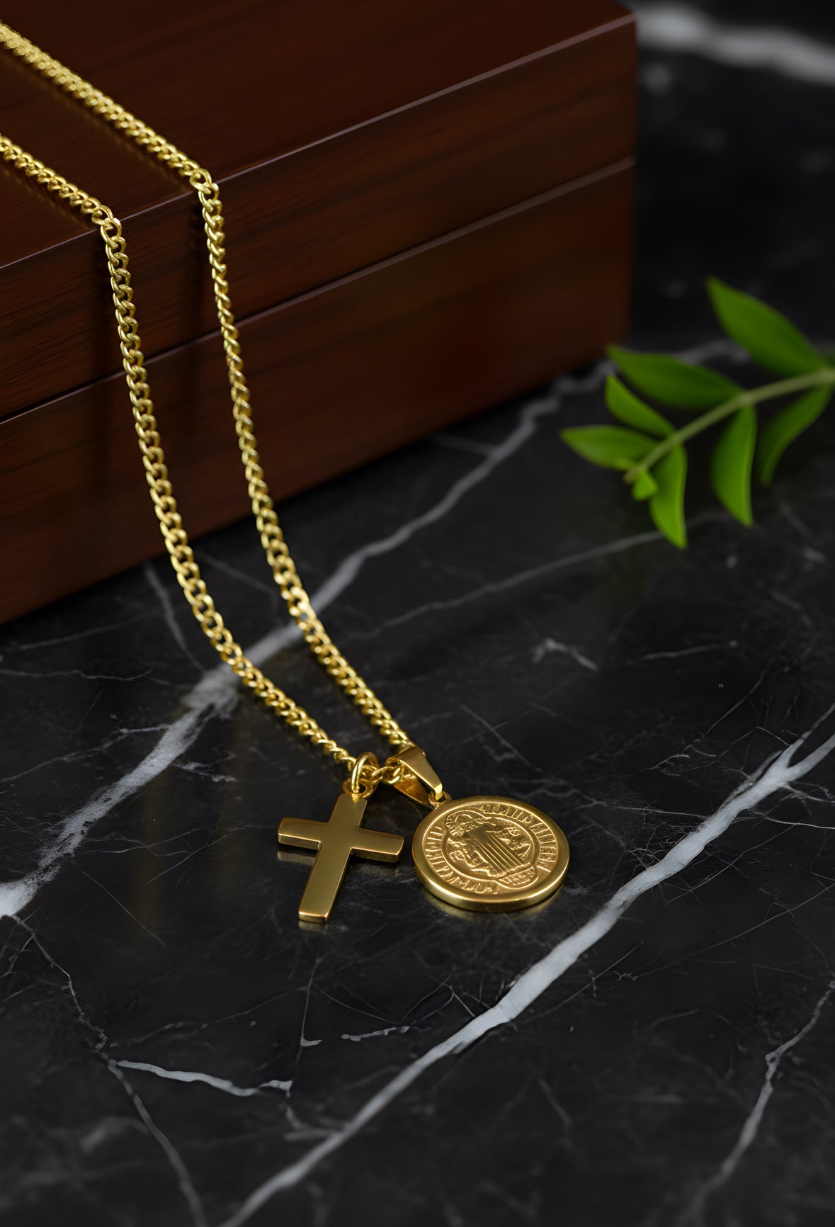 Colar em Aço Inoxidável banhado em ouro - reúne dois pendentes icónicos: uma cruz polida e uma medalha redonda em relevo com São Bento de um lado e uma cruz com orações em latim do outro. A corrente de elos médios confere robustez e estilo, tornando esta peça perfeita para quem procura um acessório elegante, com presença e significado.